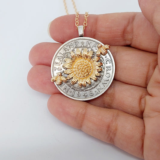 Bestseller!! Re-minted Half Crown Pendant with Golden Sunflower and Bees